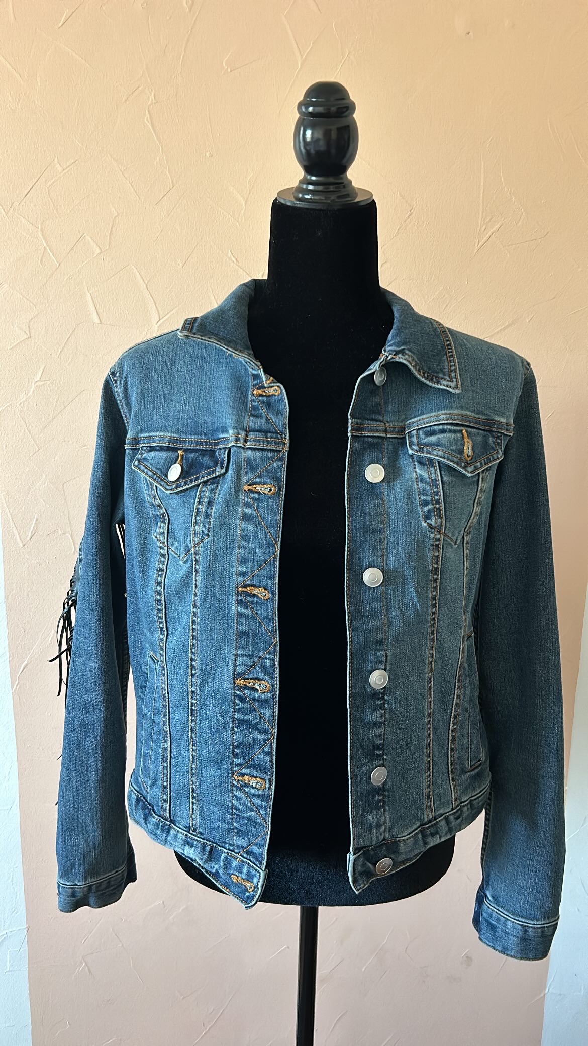 One of a kind upcycled fringe denim jacket. All denim jackets are ReSale items. Spot clean only.