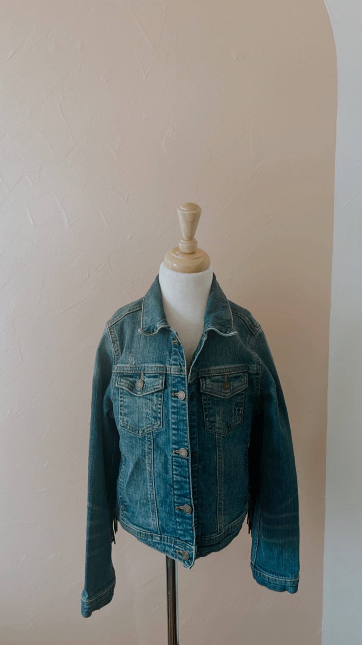 One of a kind upcycled fringe denim jacket. All denim jackets are ReSale items. Spot clean only.